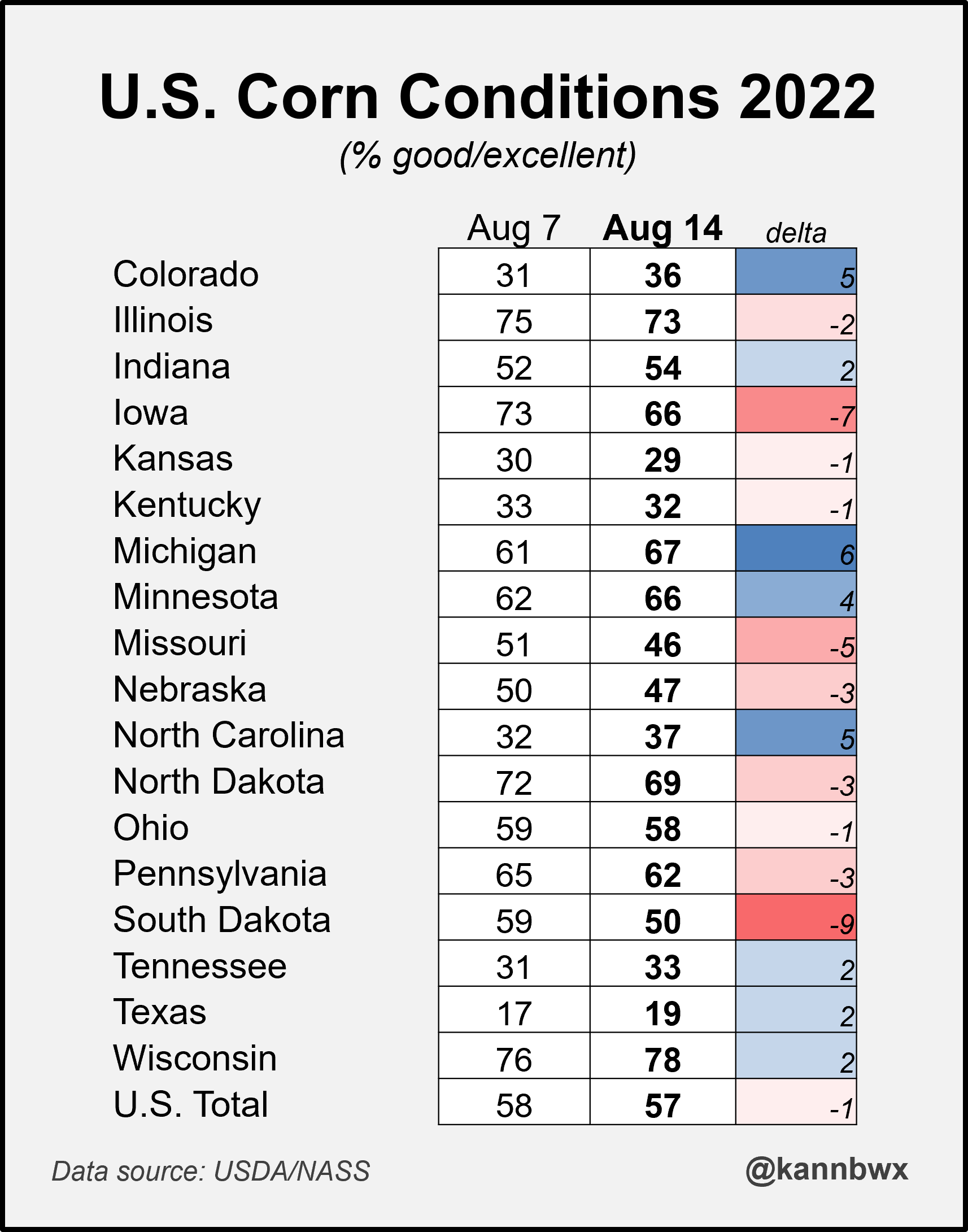 Karen Braun On Twitter Large Increases In Smaller Soy States Helped Partially Offset An 8 Pt Plunge In Iowa Soybeans Now At 63 Good Excellent Nebraska Dropped 6 And Kansas South Dakota Fell 5 Pts